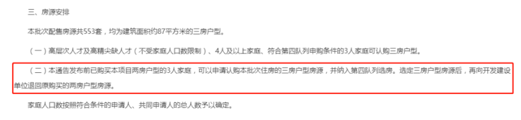 本通告发布前已购买本项目两房户型的3人家庭,可以申请认购本批次住房的三房户型房源,并纳入第四队列选房。选定三房户型房源后,再向开发建设单位退回原购买的两房户型房源。