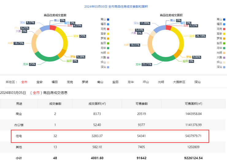 2024年3月5日新房住宅共网签32套。宝安8套;福田0套;龙岗2 套;罗湖3套;南山0套;盐田0套;龙华8套;坪山2套;光明6套;大鹏0套;深汕3套。