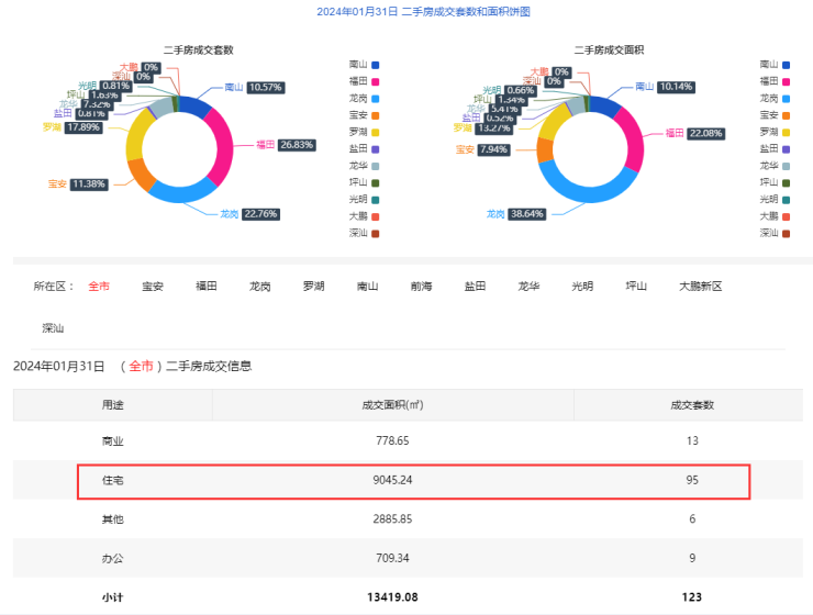 2024年1月30日二手房住宅网签95套。宝安7套;福田24套;龙岗22套;罗湖18套;南山13套;盐田1套;龙华7套;光明2套;坪山2套;大鹏0套。