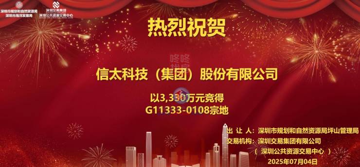近日(7月4日),坪山一宗工业用地成功出让,信太科技(集团)股份有限公司以底价3330万元竞得。