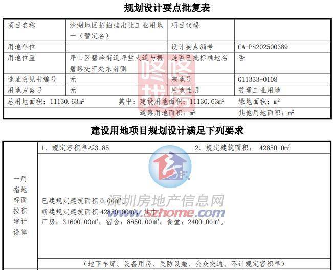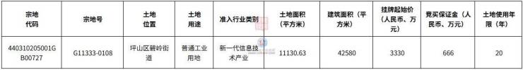 宗地号G11333-0108,土地位置坪山区碧岭街道,土地用途普通工业用地,准入行业类别新一代信息技术产业,土地面积11130.63平方米,建筑面积42580平方米,土地使用年限20年。