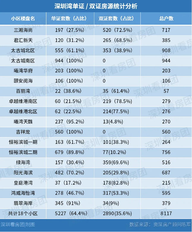 以深圳湾东滨路以南、中心路两侧为范围,共计18个小区,总户数8117户。其中单证5227户(占比64.4%),双证高达2890户(占比35.6%)