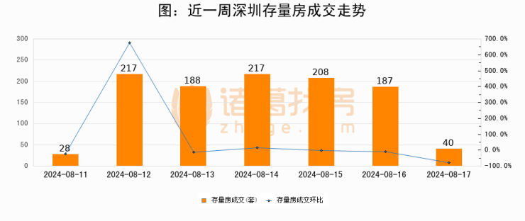 从存量房来看,2024年08月17日深圳存量房单日成交40套,比昨日减少147套,环比下降78.6%。从近一周存量房成交来看,深圳存量房日均成交套数为155套,08月17日单日成交40套,低于近一周平均水平74.2%。