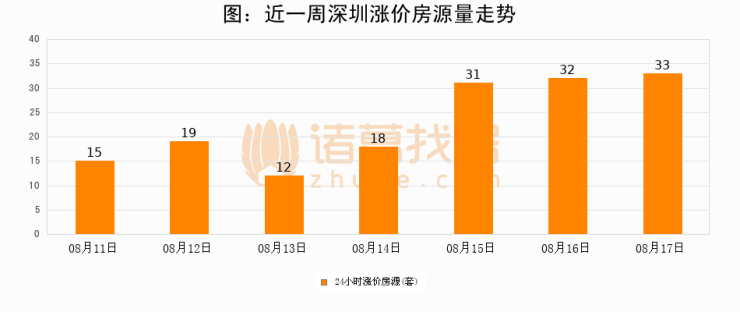 根据诸葛找房数据显示,深圳24小时涨价房源量为33套,较08月16日增加1套,环比上涨3.1%。与此同时,涨价房源占比小幅扩大,业主信心有所提升。