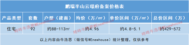 此次加推户型面积约为88-113㎡,备案均价约4.96万/㎡,单价区间约4.8-5.1万/㎡,总价区间约429-572万/套,物业公司为深圳君瑞云璟物业管理有限公司,管理费5.3元/㎡。