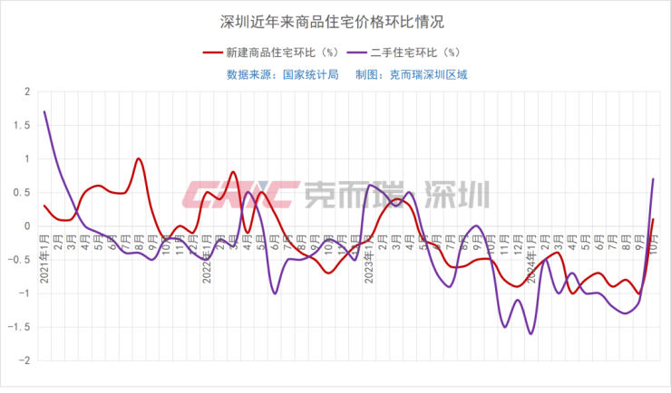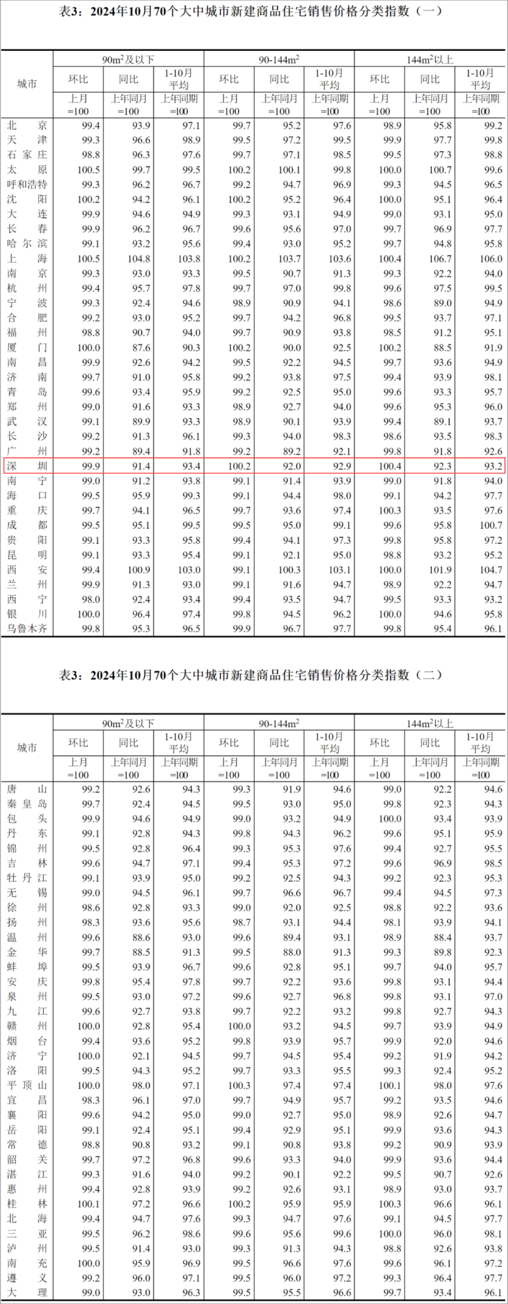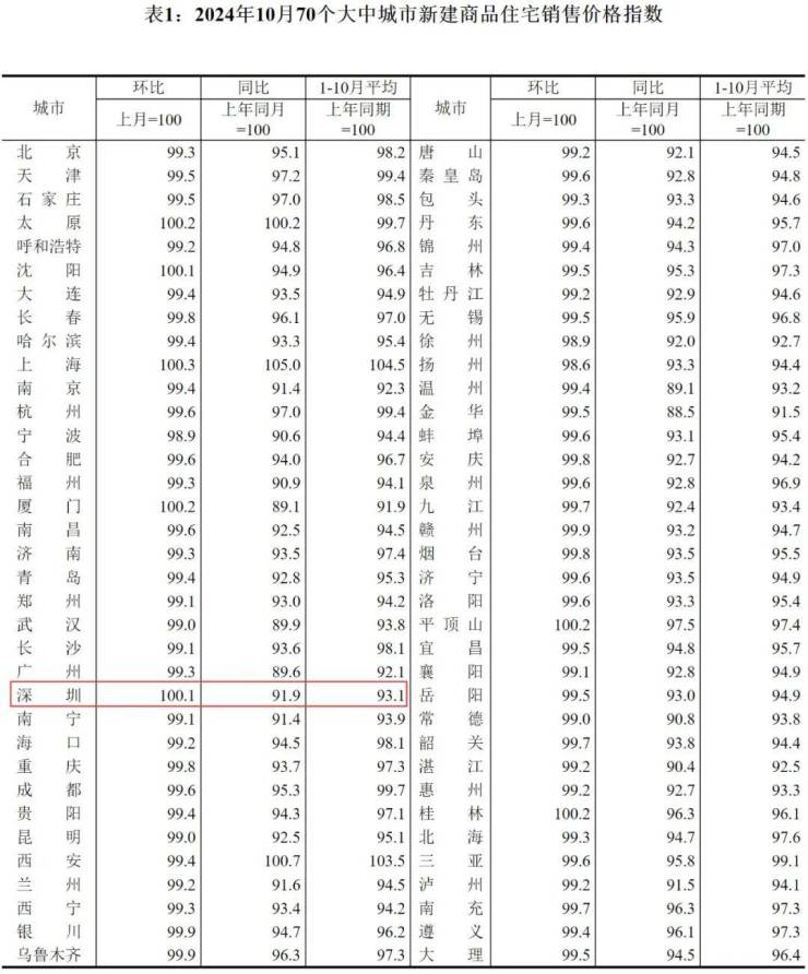 11月15日,国家统计局发布2024年10月份70个大中城市商品住宅销售价格变动情况及解读。各线城市商品住宅销售价格环比降幅收窄或转涨、同比降幅趋稳,房地产市场预期进一步改善。其中10月深圳新建商品住宅销售价格环比上涨0.1%,同比下降8.1%;二手住宅销售价格环比上涨0.7%,同比下降10.9%。