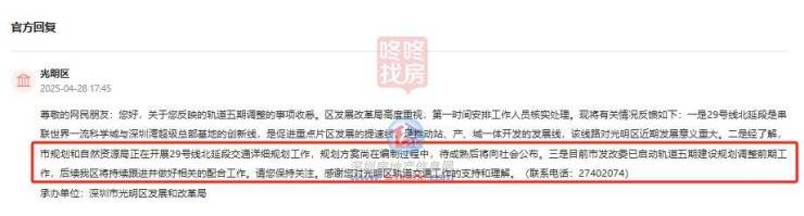 区相关部门回复:市规划和自然资源局正在开展29号线北延段交通详细规划工作,规划方案尚在编制过程中,待成熟后将向社会公布。三是目前市发改委已启动轨道五期建设规划调整前期工作,后续我区将持续跟进并做好相关的配合工作。