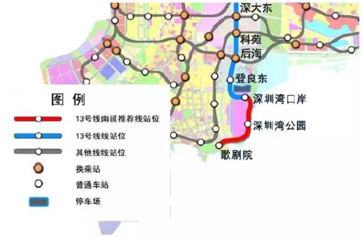 13号线南延线长4.47公里,设三站,规划由深圳湾口岸站引出,终止于后海大道东北侧,中间设深圳湾公园站、歌剧院站。