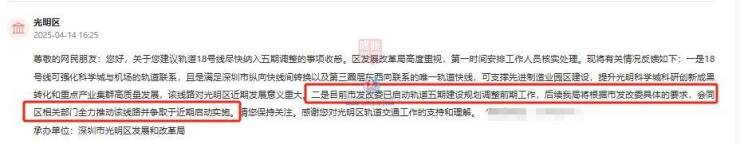 区相关部门回复:一是18号线可强化科学城与机场的轨道联系,且是满足深圳市纵向快线间转换以及第三圈层东西向联系的唯一轨道快线,可支撑先进制造业园区建设,提升光明科学城科研创新成果转化和重点产业集群高质量发展,该线路对光明区近期发展意义重大。二是目前市发改委已启动轨道五期建设规划调整前期工作,后续我局将根据市发改委具体的要求,会同区相关部门全力推动该线路并争取于近期启动实施。