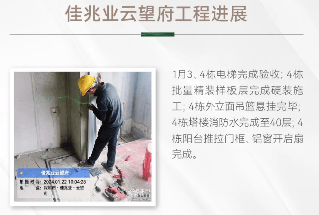 据佳兆业官方公众号1月底发布的关于云望府的信息显示,项目在进行3栋、4栋(首批推售)的室内工程及外立面装饰部分。