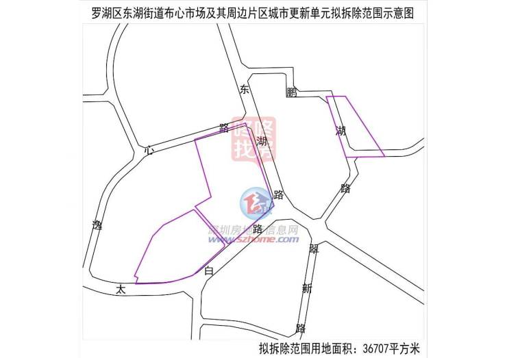 罗湖区东湖街道布心市场及周边片区城市更新单元位于太白路与东湖路交汇处,拟拆除范围用地面积36707平方米,拟更新方向为居住、商业等功能。