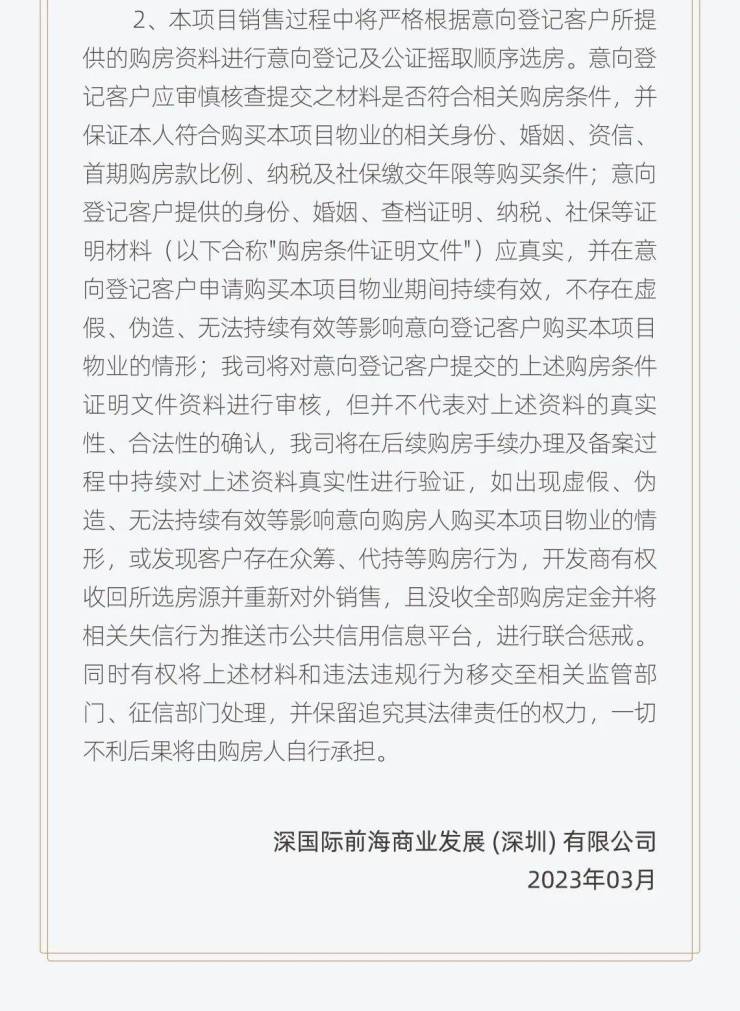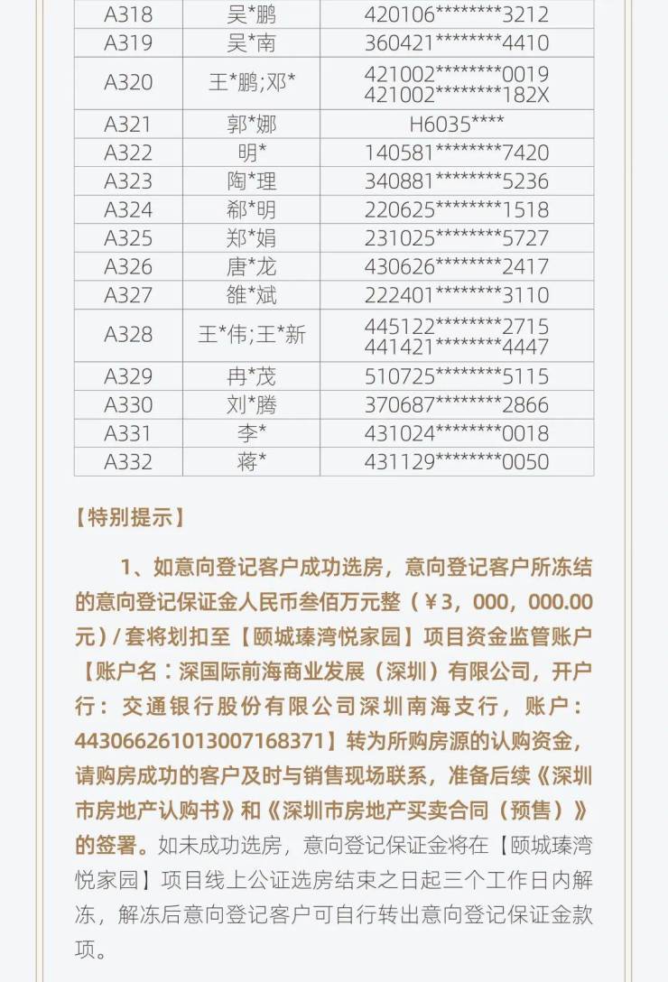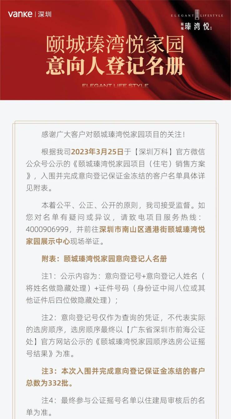3月30日,位于前海的万科瑧湾悦二期发布诚意登记人名册,共登记332批客户。3月31日10:00,项目将在前海公证处进行选房顺序号公证摇号,4月1日,正式选房。