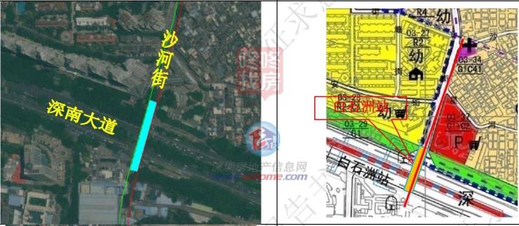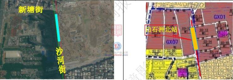 新塘街与沙河街交叉口,沿沙河街南北方向布置。车站周边分布有深业世纪山谷花园(在建)和绿景璟庭(在建)。