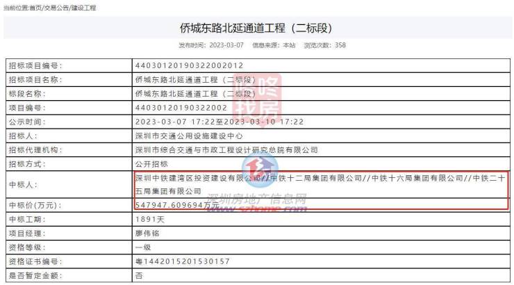 侨城东路北延通道工程(二标段)中标人深圳中铁建湾区投资建设有限公司//中铁十二局集团有限公司//中铁十六局集团有限公司//中铁二十五局集团有限公司,中标金额547947.609694万元,中标工期1891天。