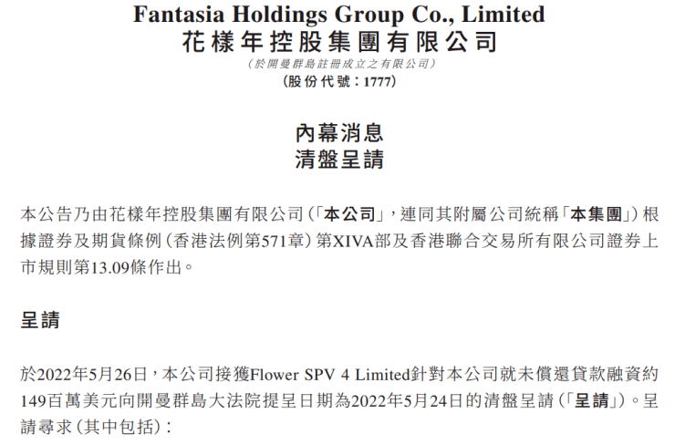 公告称,5月26日花样年接获Flower SPV 4 Limited针对花样年就未偿还贷款融资约1.49亿美元向开曼群岛大法院提呈日期为2022年5月24日的清盘呈请。呈请寻求(其中包括):根据开曼群岛公司法第92(d)条将花样年清盘;及委任共同清盘人。