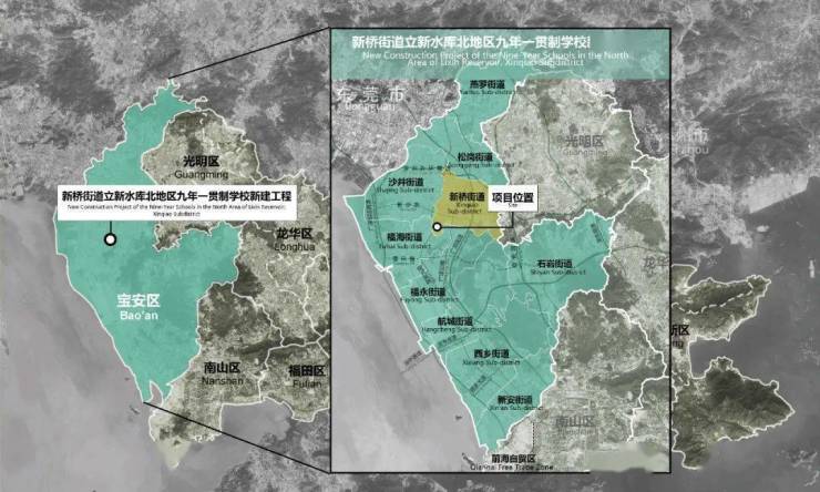 新桥街道立新水库北地区九年一贯制学校新建工程项目位于宝安区新桥街道,宝安大道以东,丰洋路以西,西侧与福海街道交界。