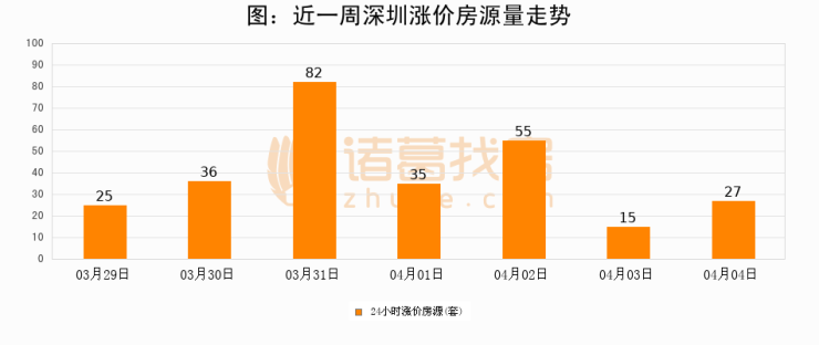 根据诸葛找房数据显示,深圳24小时涨价房源量为27套,较04月03日增加12套,环比上涨80%。与此同时,涨价房源占比小幅扩大,业主信心有所提升。