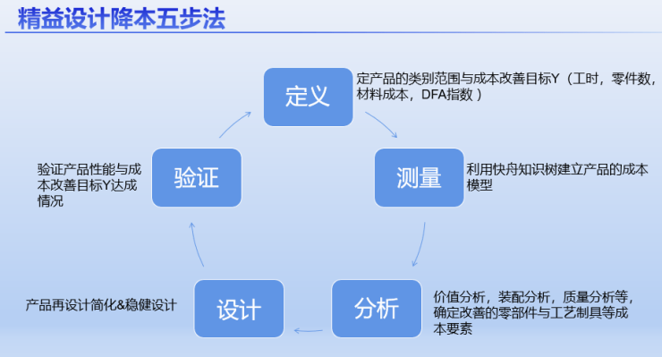 快舟(精益)设计的降本逻辑,按照六西格玛设计DMADV方法论的路径,结合软件总结如下图所示五个步骤,