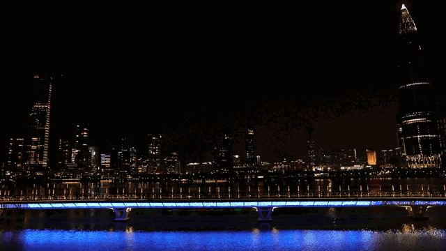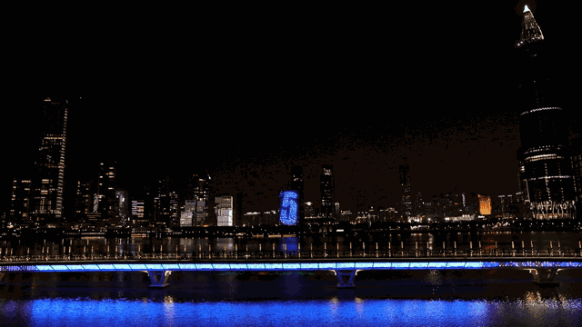 少顷,一声“春雷”乍响。只见绚烂灯光一瞬间点亮彼岸的楼群,光影在楼宇间升腾、翻涌,流光、溢彩,与墨蓝的夜空交相辉映。