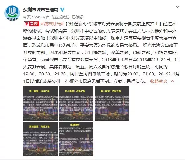 深圳市城市管理局公布主题为“辉煌新时代”的深圳中心区灯光表演将在国庆前正式登场,表演从9月28日至12月31日每!晚!推!出!