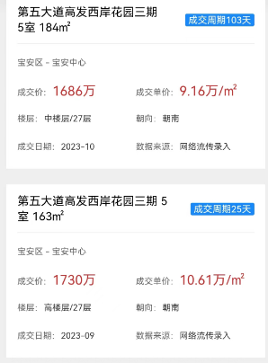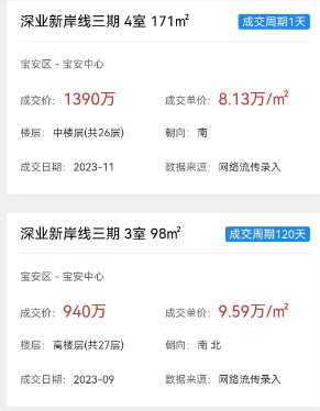 例如,深业新岸线的二手房参考价约8.84万/㎡,挂牌价在10万/㎡左右。根据行舟深房小程序显示成交价在8-9万/㎡(仅供参考,具体以实际成交价为准)。
