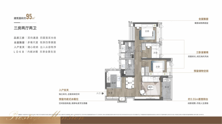 户型图上未标注尺寸,其中建面约95㎡户型为竖厅设计,建面约108㎡、109㎡产品分别有竖厅、横厅布局可选,建面约138㎡的户型为客餐厅互相独立的通透格局。