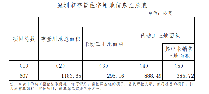 汇总表显示,深圳存量住宅项目607个,存量用地总面积1183.65公顷,未动工土地面积295.16公顷,已动工土地面积888.49公顷(其中未销售土地面积385.72公顷)。