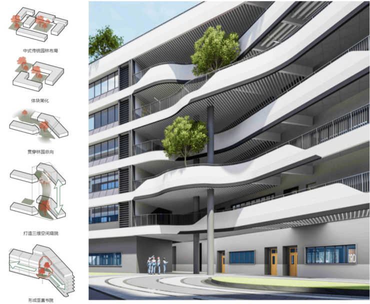 项目将中式传统园林的“亭台楼阁、轩榭廊舫”简化并重新演绎,通过采用“围合式生态立体院落”布局,规划集中开放的地面园林和分散的立体庭院,建立教育功能与城市社区及环境气候之间的和谐对话。