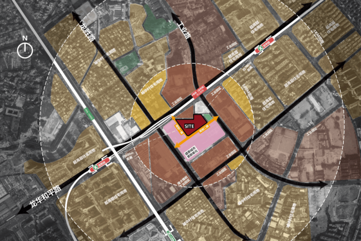 场地两侧贴邻市政道路,西南侧为规划一路及商业和宿舍区,东南侧为规划二路及商业和厂房区,基地空间受高密度超高层工业区与高架轨道多重挤压。面对城市与教育空间的复杂关系,设计核心聚焦于调和二者矛盾,营造宜学宜思的静谧校园。