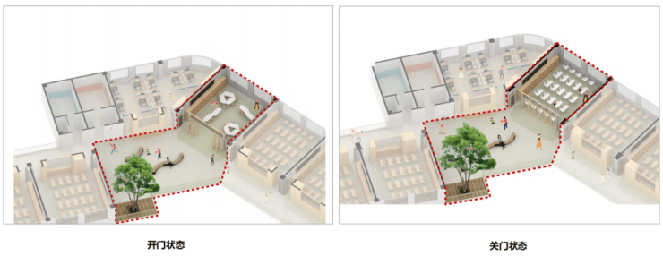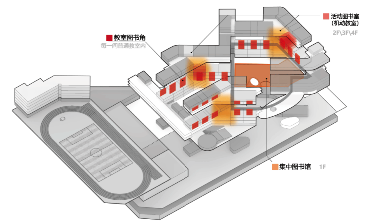 项目合理安排教学楼、操场、图书馆等空间关系,旨在建设一个“让学生在校园每个角落都能阅读”的书香校园。以首层图书馆为核心,通过在各个组团中的机动教室与活动平台进行阅读交互,以及在每一间教室设置随处可见的图书角空间,实现三阶区位的展阅空间延伸至整个校园。