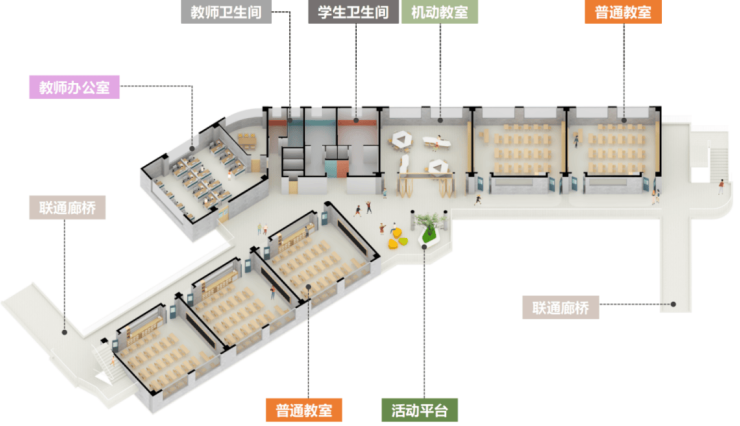每个教学单元模块中心位置设置活动平台,满足课间活动的需求。卫生间、教师办公室和机动教室围绕活动平台布置,服务于两侧的教学空间,形成可持续的基础教育功能组团,同时提供弹性的空间布局,以适应师生日常学习生活的多样化需求。
