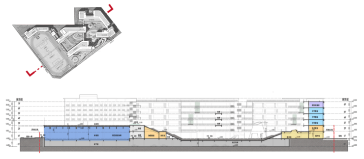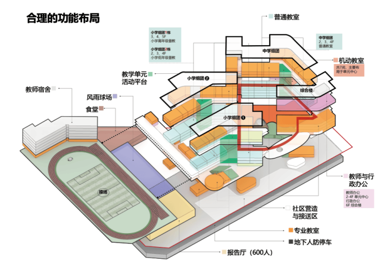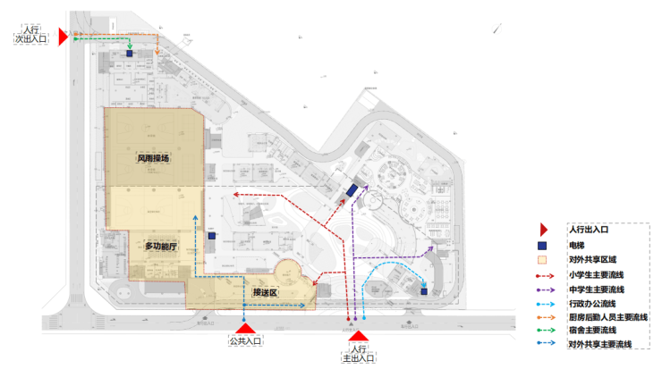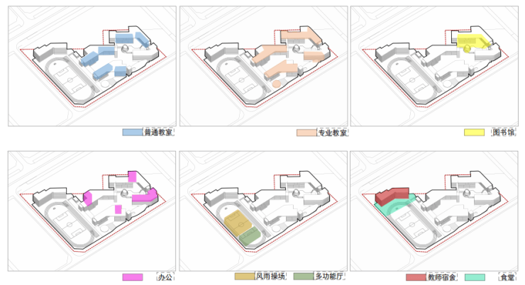 项目主入口设于规划二路上,学生通过入口广场分散到各栋教学楼。教学楼之间通过连廊紧密连接,体育场位于三楼,与教学楼紧密相连。每个教学单元均设有活动平台,方便师生在课间活动。