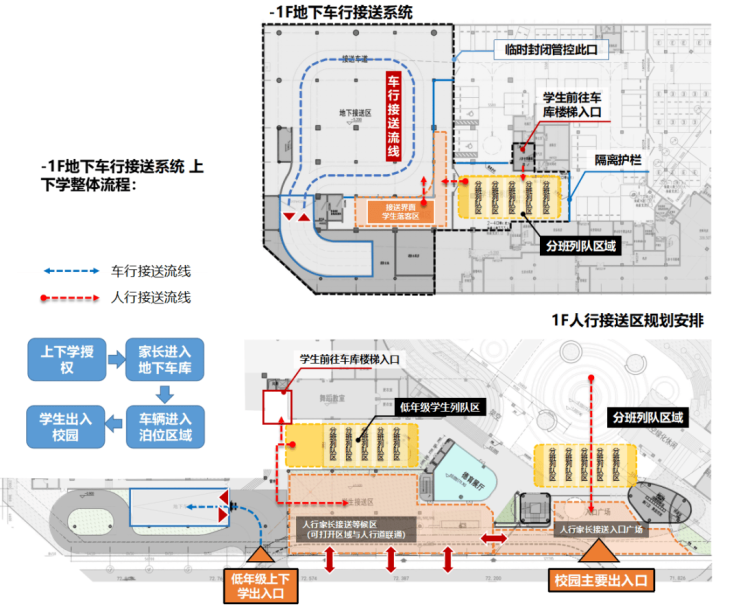 校园沿规划二路设计有大空间尺度的入口广场和接送等候区,满足家长等候和接送需求。具有科技特征的入口雨棚设计增强了学校的标识性。同时,在地下室规划了安全高效的车行接送路线,确保校园交通的流畅和安全。