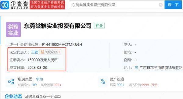 天眼查APP显示,8月3日,东莞棠雅实业投资有限公司成立,注册资本15亿人民币,法定代表人为王路,经营范围包含住房租赁、非居住房地产租赁、园区管理服务、工程管理服务、房地产开发经营。股东信息显示,该公司由华为投资控股有限公司全资持股。