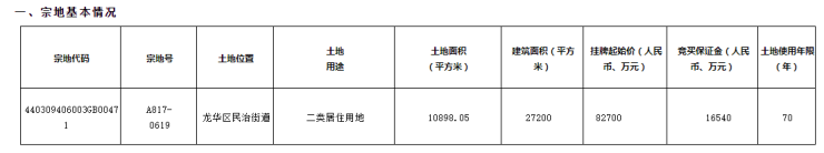龙华A817-0619宗地为二类居住用地,土地面积10898.05㎡,建筑面积27200㎡,挂牌起始价8.27亿元,竞买保证金1.654亿元。