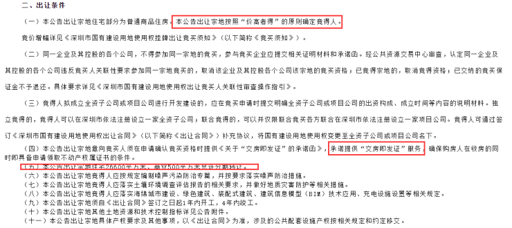 本宗地按照“价高者得”的原则确定竞得人,拿地1年内开工,4年内竣工;提供“交房即发证”服务等。