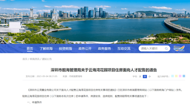 刚刚,深圳市前海管理局发布了《关于云海湾花园项目住房面向人才配售的通告》。