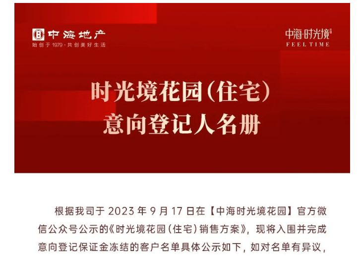 刚刚,中海时光境公示诚意登记入围名单,共有299批意向购房者入围,项目本批共推出273套房源,入围比例超过1:1。项目将于9月26日选房。(文末附入围名单)