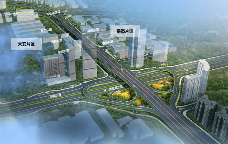改造车公庙立交并与主桥相连接,实现香蜜湖路-滨河大道及香蜜湖路-富强路“快-快”衔接的同时,完善立交整体的其他转向功能。