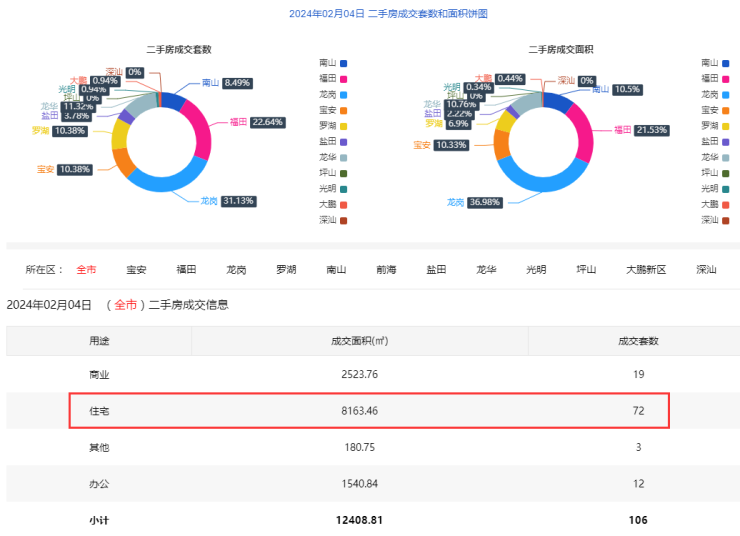 2024年2月4日二手房住宅网签72套。宝安7套;福田12套;龙岗21套;罗湖9套;南山9套;盐田4套;龙华9套;光明0套;坪山0套;大鹏1套。
