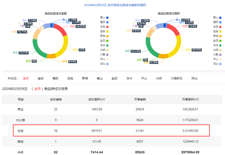 2024年2月4日新房住宅共网签56套。宝安14套;福田1套;龙岗9套;罗湖5套;南山1套;盐田0套;龙华13套;坪山3套;光明6套;大鹏0套;深汕4套。