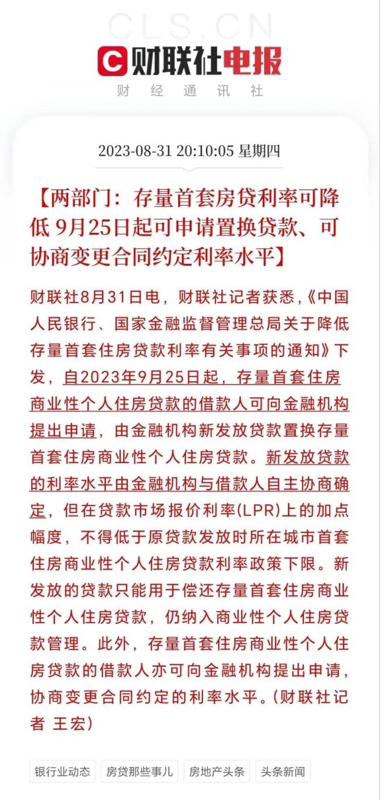 紧接着8月31日,中国人民银行、国家金融监督管理总局发布关于降低存量首套住房贷款利率有关事项的通知。