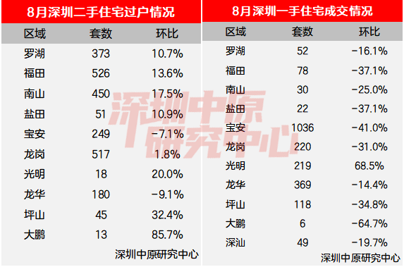 从各区的情况来看,8月二手楼市成交统计中,只有宝安与龙华两区成交量出现了下滑,其他区域都有不同程度的上升。