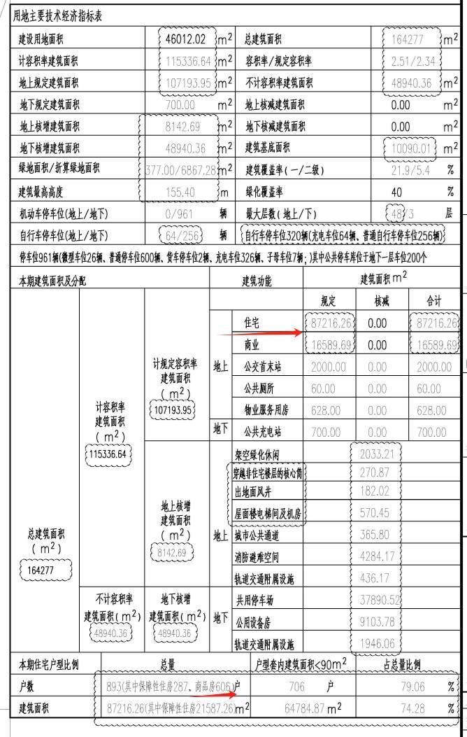 总规划户数为 893 户(商品房606 户,人才房287 户)。其中,1 栋 2 单元为 3 梯 5 户设计,1 栋 3 单元为 2 梯 5 户设计,1 栋 1/4 单元为 3 梯 6 户设计。地下共三层,停车位达 961 个,占比为 1:1.15。