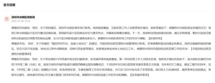 在近期光明区商务局答复网友留言时就提到,将持续加快推动招商,通过多种渠道,靶向引进契合枢纽特点和居民日常需求的商业品牌,全力打造光明的轨道交通商业新名片。