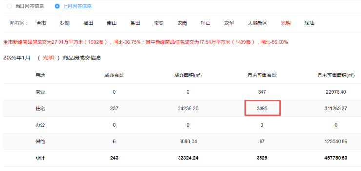 此种做法也是颇有成效的,截至1月末,光明可售住宅仅3000套出头,比坪山区的库存还要小。