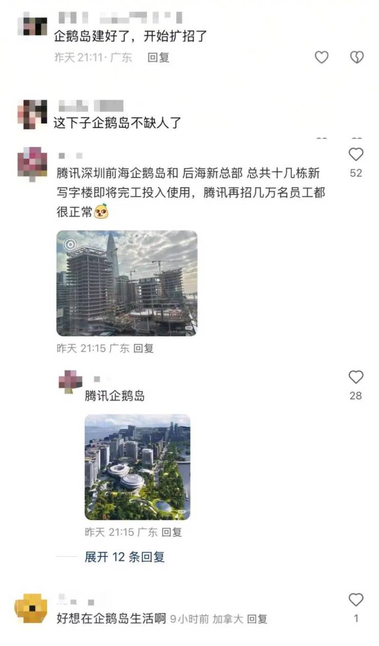 位于深圳宝安区前海大铲湾岛的“互联网+”未来科技城(“企鹅岛”),是腾讯全球总部,占地约130万平方米,分为两期建设,建成后可以容纳8万-10万人办公,将近5000人在此生活。其中,04、05街坊为项目一期计划在今年6月首批交付,二期(总部办公区、科技馆等)2028年投用。