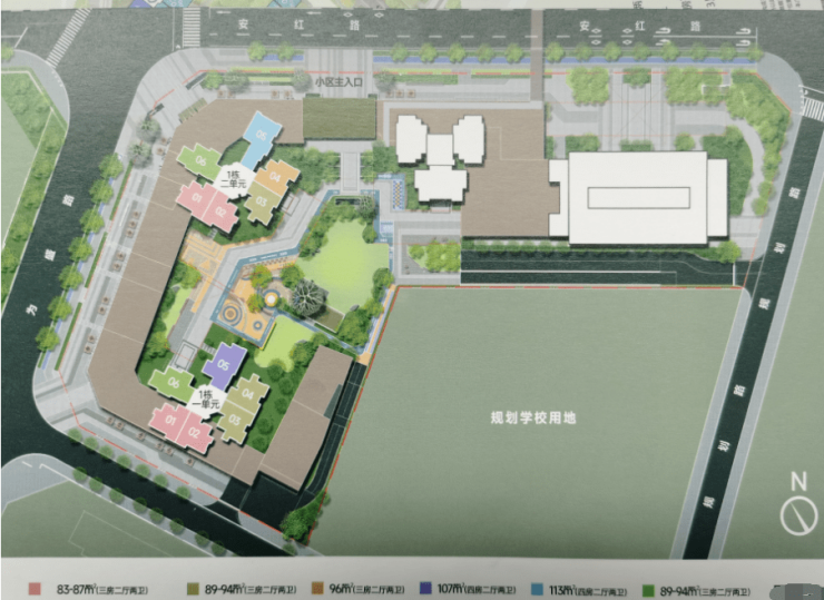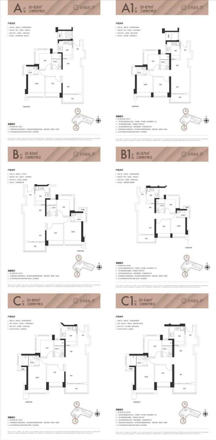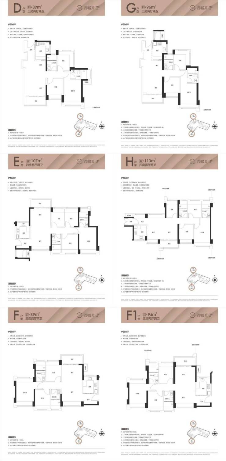 主推产品以3-4房为主,有多个面积段可选,分别为建面约83-87㎡、89-94㎡、96㎡、107㎡、113㎡。