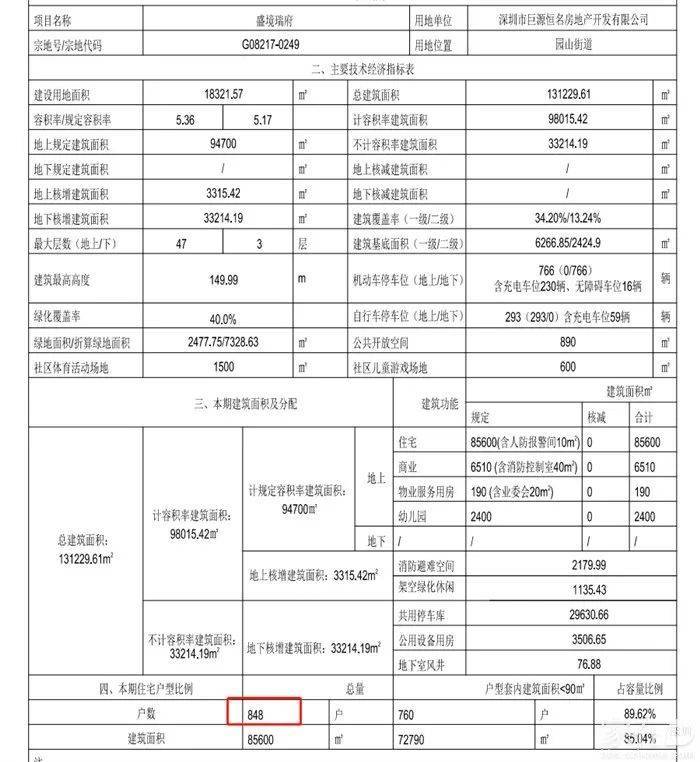项目规划为4栋47/3层(149.99米),容积率5.36,车位766辆,住宅848套,套内小于90平760套,占比89.62%。
