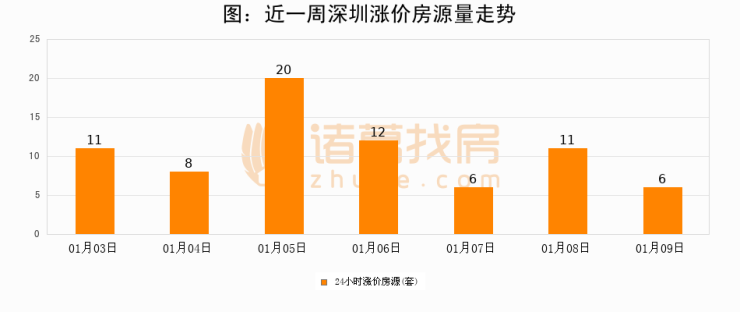 根据诸葛找房数据显示,深圳24小时涨价房源量为6套,较01月08日减少5套,环比下降45.5%。与此同时,涨价房源占比小幅回落,对于购房者来说是一个入市窗口期,购房者可抓住时机入市。